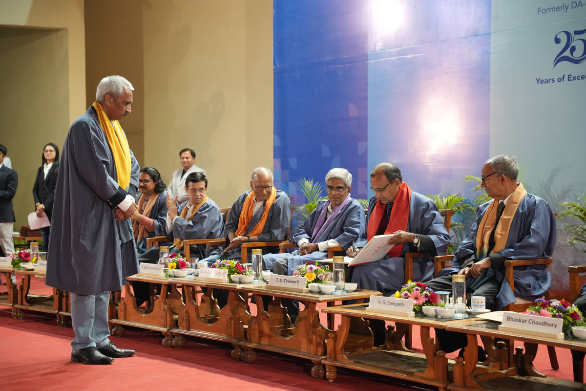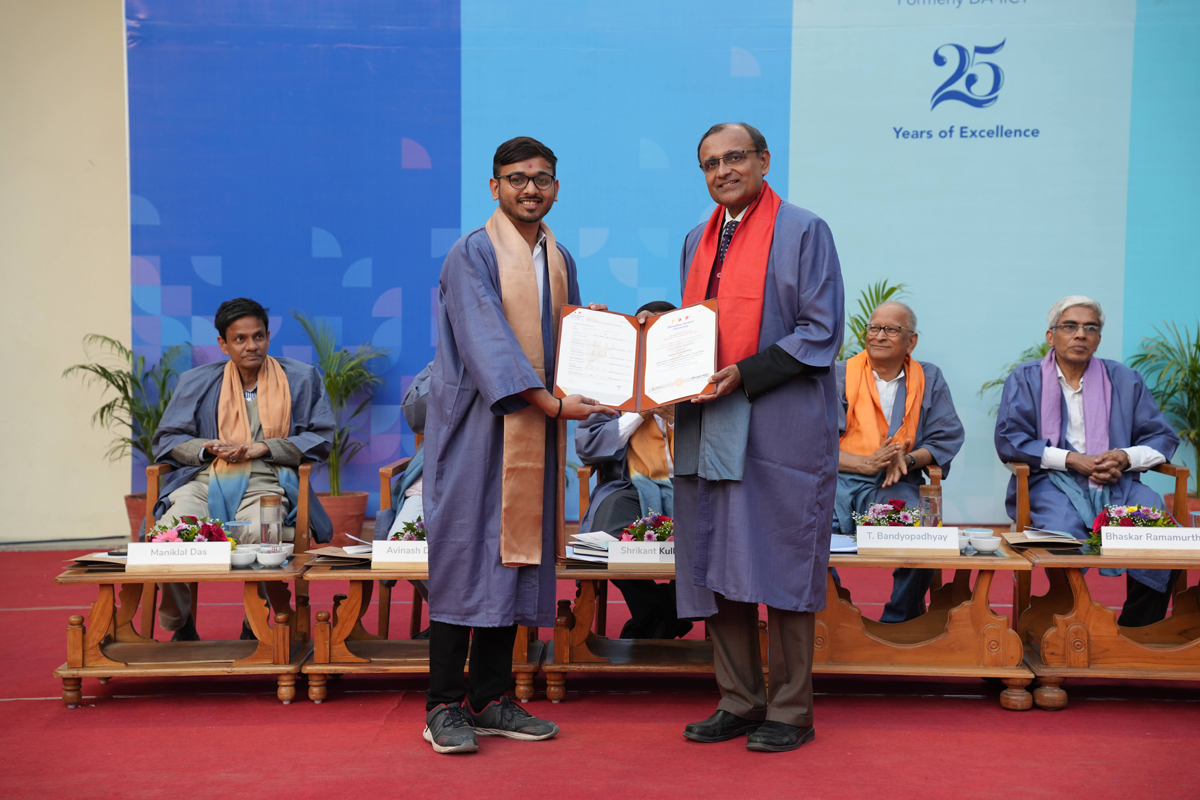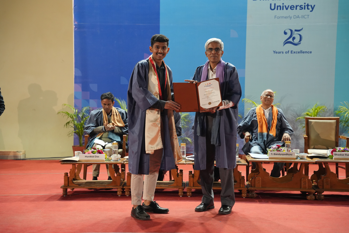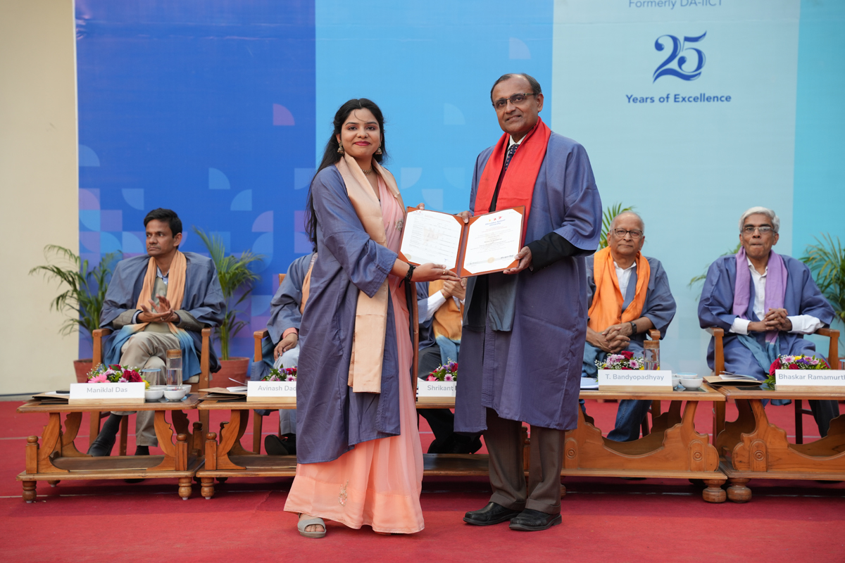 The graduating cohort included 348 students from B.Tech (ICT) B.Tech (Mathematics & Computing), B.Tech (Honours) in ICT with minor in Computational Science and B.Tech (EVD). A total of 295 postgraduate degrees were awarded across M.Tech (ICT), M.Tech (EC), M.Sc (IT), M.Sc (Data Science), M.Sc (Agriculture Analytics), and M.Des (Communication Design) programmes. Additionally, 6 scholars received Ph.D. degrees.