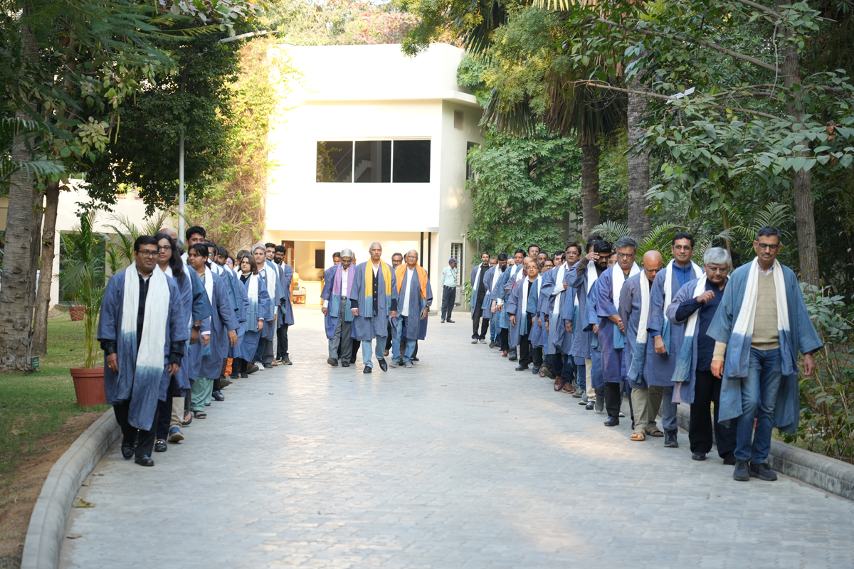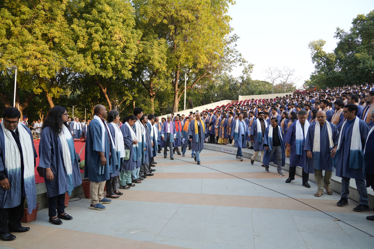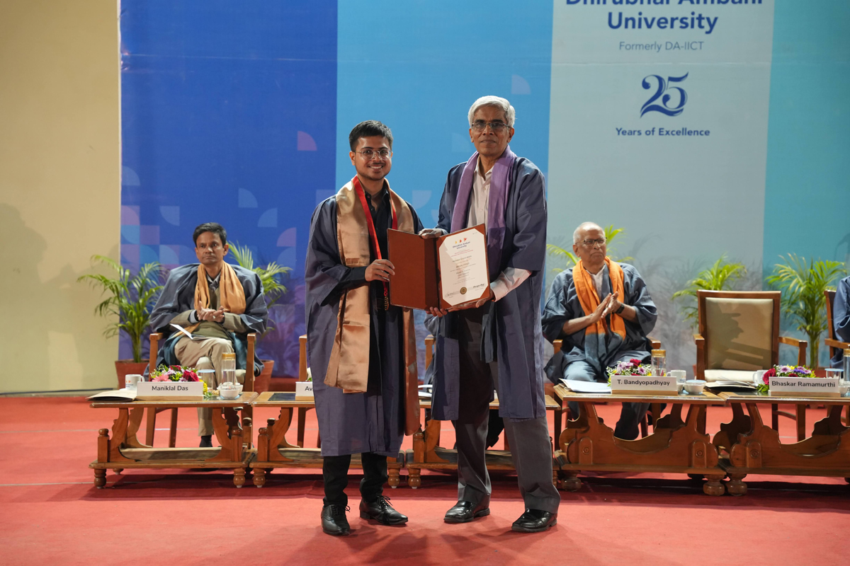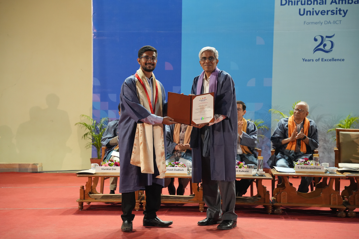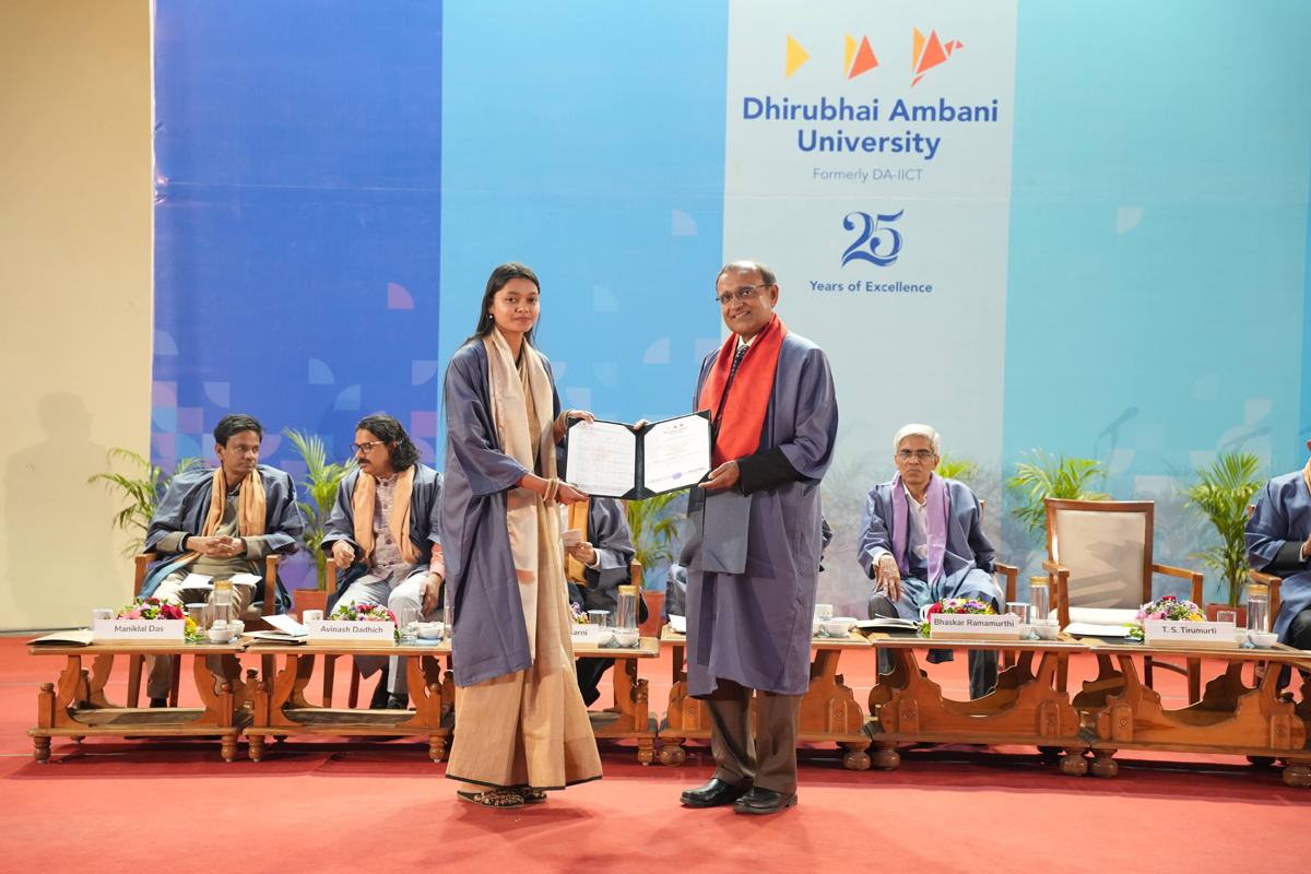 The graduating cohort included 348 students from B.Tech (ICT) B.Tech (Mathematics & Computing), B.Tech (Honours) in ICT with minor in Computational Science and B.Tech (EVD). A total of 295 postgraduate degrees were awarded across M.Tech (ICT), M.Tech (EC), M.Sc (IT), M.Sc (Data Science), M.Sc (Agriculture Analytics), and M.Des (Communication Design) programmes. Additionally, 6 scholars received Ph.D. degrees.