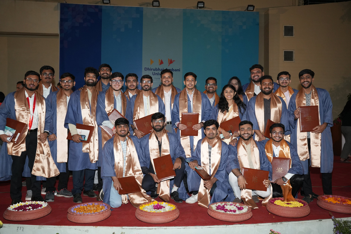 A special message from the President of Dhirubhai Ambani University, Tina Anil Ambani, was shared with the graduating class. In her message, she emphasised that while you continue to push the envelope in terms of technology-driven innovation, let human-centred design be your differentiator. She further added that while chasing your goals, never lose sight of your greatest asset: your health. Physical and mental health underpin every endeavour you embark upon and shore you up in times of stress and struggle. So, be proactive; nurture your bodies and nourish your minds.
