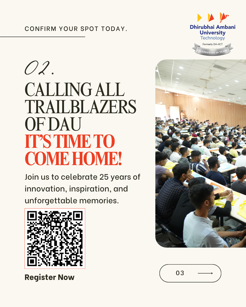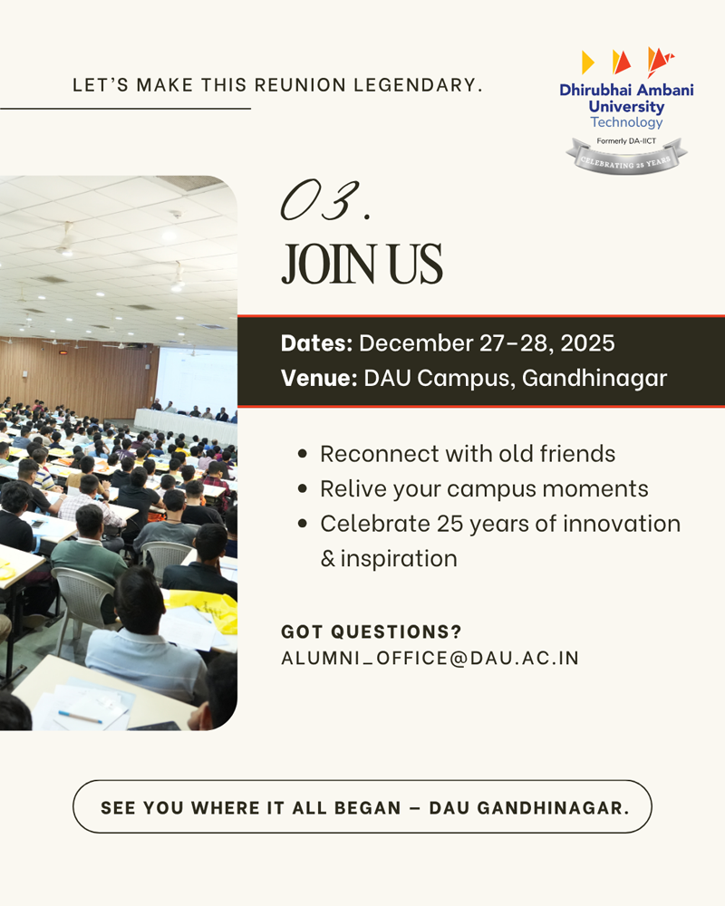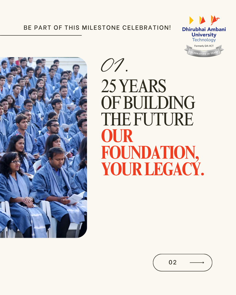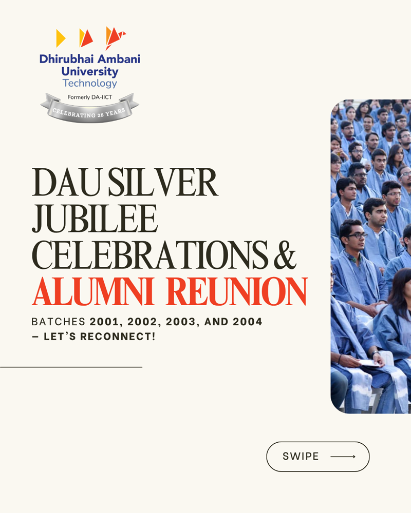 Celebrating 25 years of excellence of Dhirubhai Ambani University (DAU), the university is organising an exclusive Silver Jubilee Alumni Reunion for its founding batches. This momentous occasion is specifically for the trailblazers of the 2001, 2002, 2003, and 2004 classes, honouring their significant role in establishing the institution's esteemed legacy. The university extends a special invitation to these foundational alumni to return to the campus for a celebration like no other.