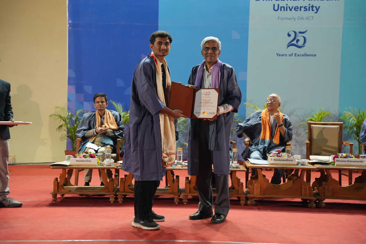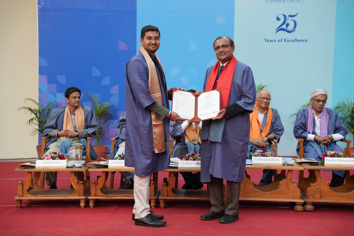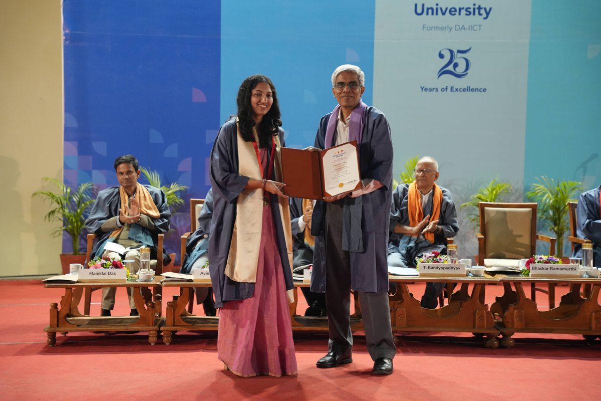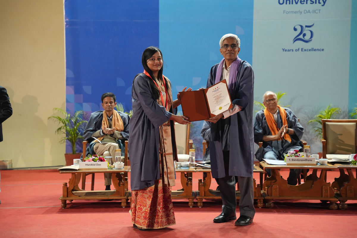 The graduating cohort included 348 students from B.Tech (ICT) B.Tech (Mathematics & Computing), B.Tech (Honours) in ICT with minor in Computational Science and B.Tech (EVD). A total of 295 postgraduate degrees were awarded across M.Tech (ICT), M.Tech (EC), M.Sc (IT), M.Sc (Data Science), M.Sc (Agriculture Analytics), and M.Des (Communication Design) programmes. Additionally, 6 scholars received Ph.D. degrees.