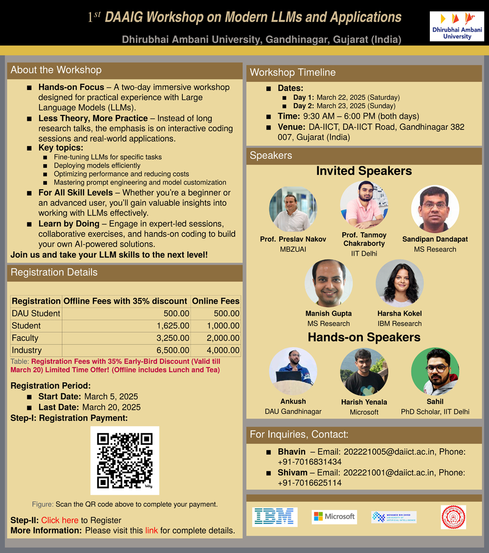 DAU announces the 1st DAAlG Workshop on Modern LLMs and Applications, hosted by Dhirubhai Ambani University, Gandhinagar! This two-day immersive workshop, Designed for hands-on learning, focuses on practical experience with large language models (LLMs) and is open to all skill levels—whether you're a beginner, student, faculty member, researcher, or industry professional.