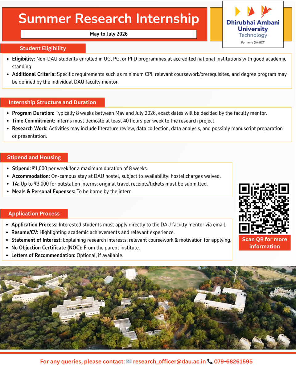 - Currently enrolled UG, PG and PhD students in good academic standing at accredited national institutions are eligible to apply (students currently enrolled at DAU are not eligible for this program).